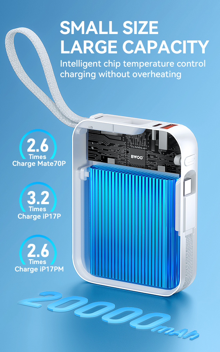 Safety should never be compromised when dealing with electronics. A top-tier power bank, especially one designed for super fast charging, must incorporate robust safety mechanisms. As highlighted in the BWOO product image, features like "Intelligent chip temperature control charging without overheating" are paramount. This intelligent chip technology actively monitors and regulates the power bank's temperature during charging and discharging, preventing overheating, overcharging, over-discharging, and short circuits. Choosing a power bank from a reputable brand like BWOO guarantees that your devices and the power bank itself are protected, offering a secure and reliable charging experience.Portability and Design: Small Size, Large Capacity