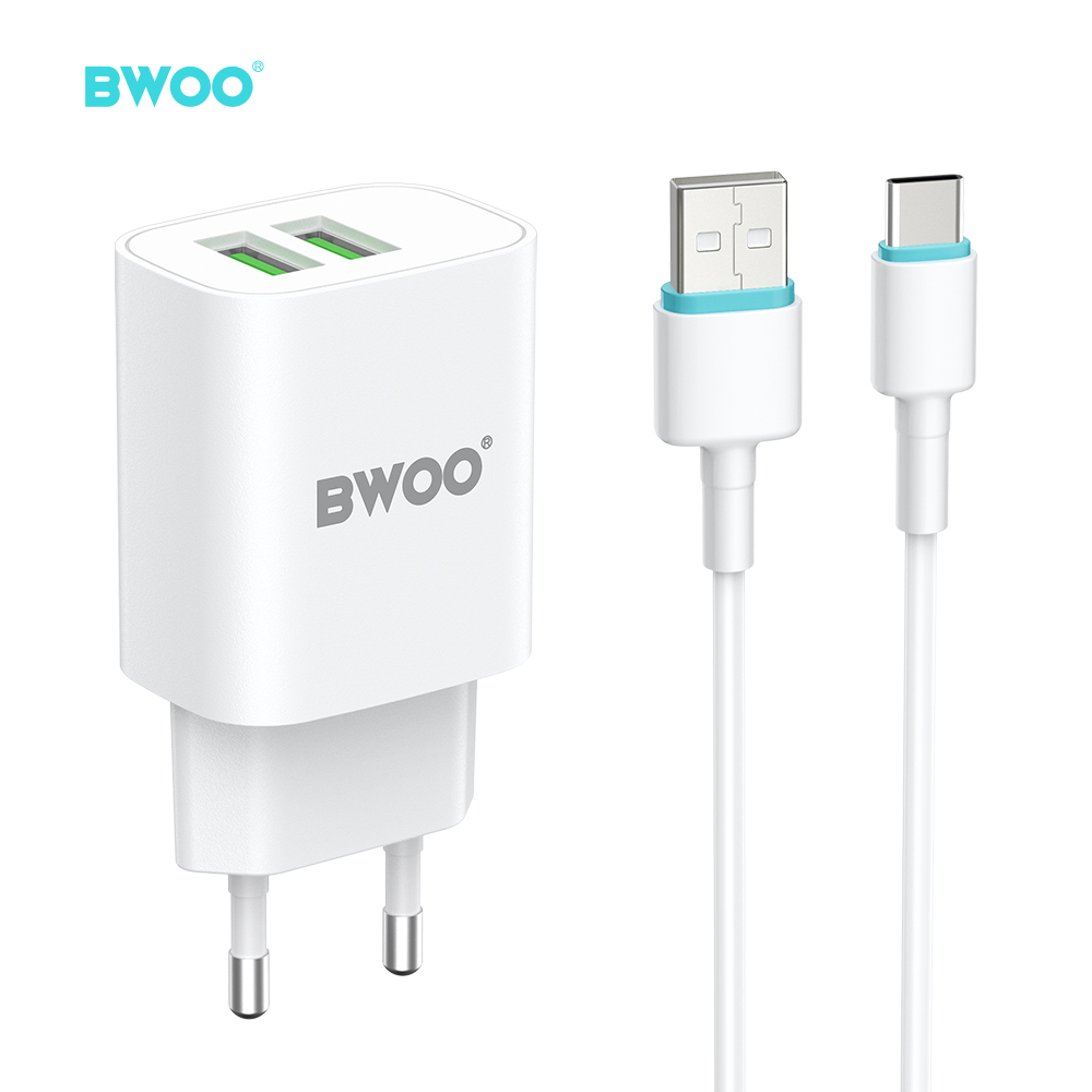 BWOO 2.4A Dual Port USB Wall Charger EU Plug with USB C Cable Fast Charge Compact Travel